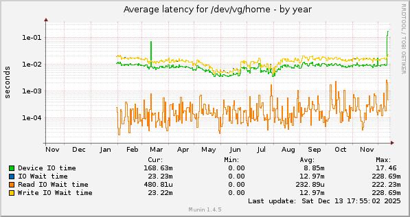 | This graph shows average waiting time/latency for different categories of disk operations. The times that include the queue times indicate how busy your system is. If the waiting time hits 1 second then your I/O system is 100% busy. |
